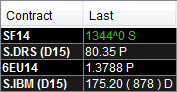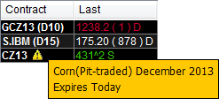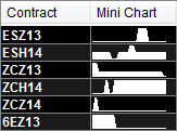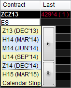 Contract will include most of the time a proper contract, but some of the already mentioned "user-typed expressions" are accepted as well. Click on an empty Contract cell to start typing in a contract, such as ZCZ13 (and hit Enter when done). Auto-complete suggestions are provided as you type. For an in-depth look at this facility, please follow this link. |